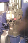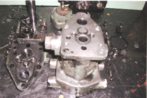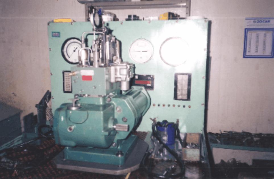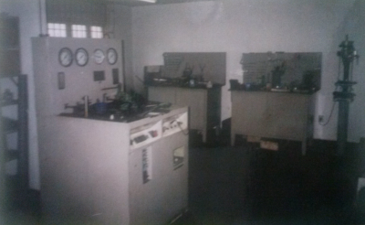 Aspecto do Laboratório de revisão de reguladores de velocidade, observando-se em primeiro plano, a bancada simuladora de funcionamento, que permite a regulagem final, na oficina, simulando-se a operação local.